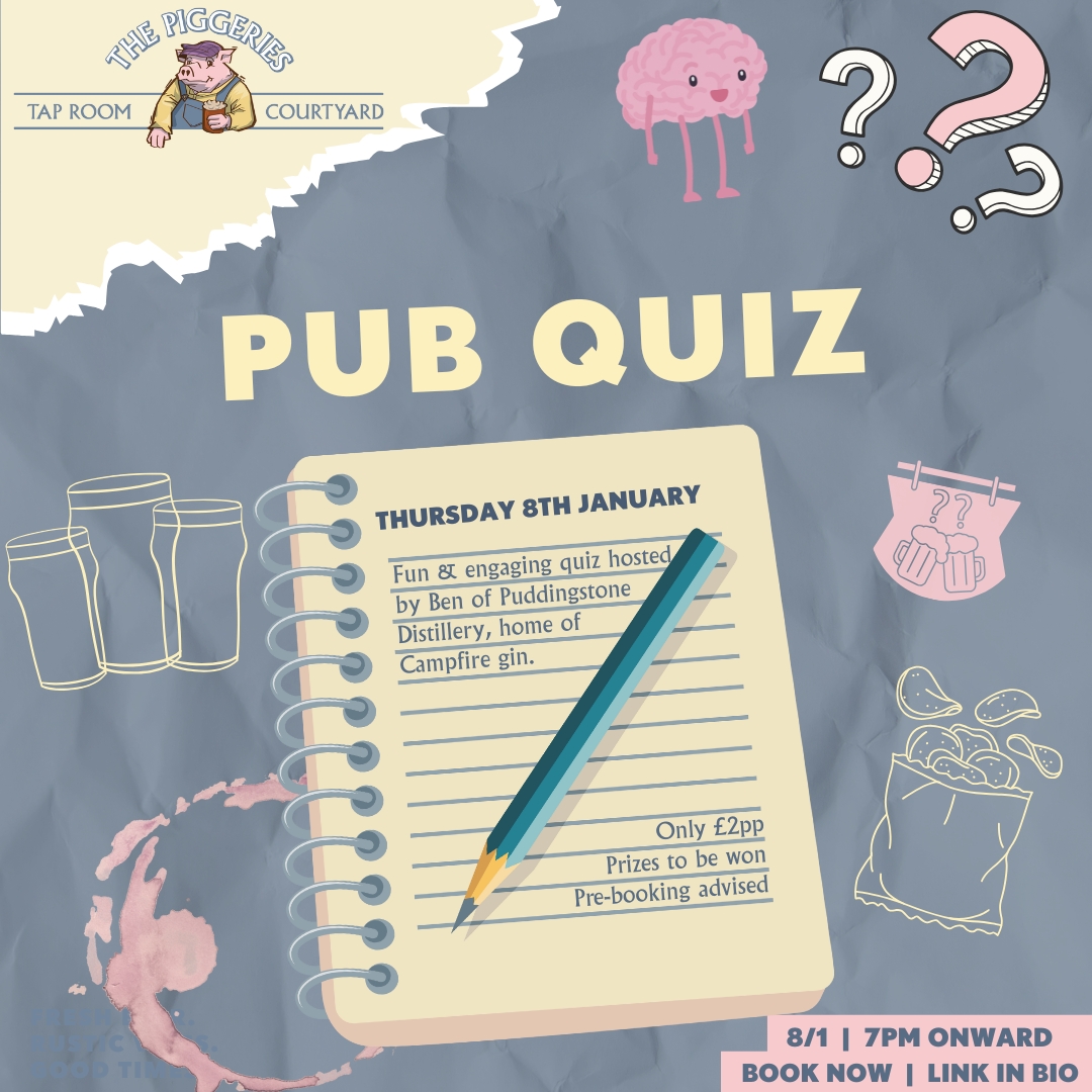 BOOK NOW for our Pub Quiz on Thursday January 8th, hosted at The Piggeries Courtyard and Taproom.