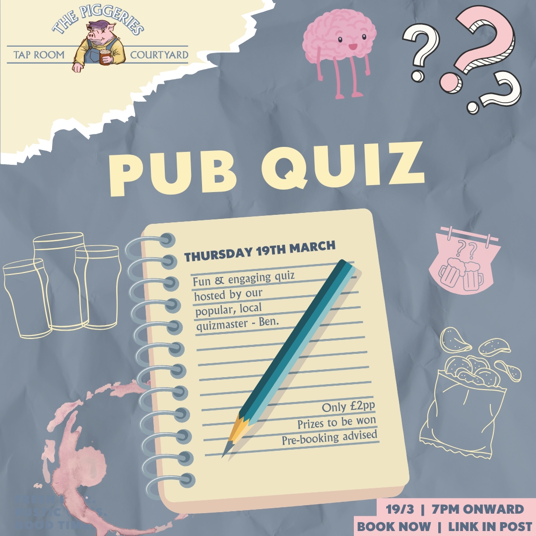 BOOK NOW for our Pub Quiz on Thursday March 19th, hosted at The Piggeries Courtyard and Taproom.